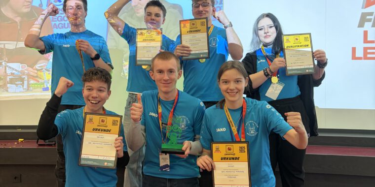 Nach vergleichsweise kurzer Vorbereitungszeit, trat das Team DomGym am vergangenen Freitag, dem 23.01.2026 zum ersten Mal bei einem Wettbewerb der First Lego League an. In Vorbereitung auf dieses Event bauten die Schülerinnen und Schüler des Technik-Wahlpflichtkurses Roboter aus Lego, programmierten diese selbst, sodass möglichst viele Aufgaben auf einem vorgegebenen Spielfeld gelöst werden. Weiterhin wurde ein Forschungsprojekt zum diesjährigen Wettbewerbsthema Archäologie von den Schülerinnen und Schülern bearbeitet und als Präsentation ausgearbeitet. Insgesamt konnte das Team einen tollen Wettkampf zeigen. So gewann DomGym die Kategorie Forschung und kam in den Kategorien Grundwerte und Roboter Game unter die ersten 4 Teams. Aufgrund der Gesamtpunktzahl reichte es für das Team des Domgymnasiums Merseburg für den 2. Platz. Somit qualifizierten sie sich für das Semifinale am 28.02.2026 in Wildau.
